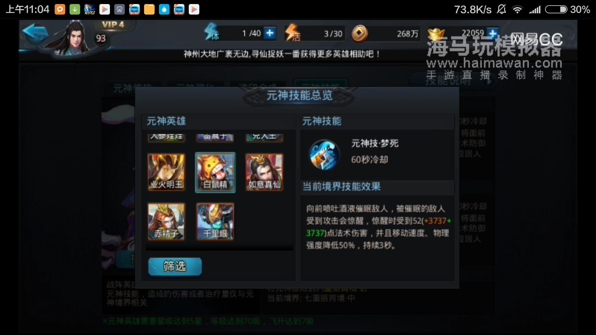 这段话可能有些歧义,是惊醒后3秒减益BUFF还是催眠也是3秒呢?然后测试的事实告诉我们……催眠3秒,减益也是3秒,天啊!不曾想一只小小的白鼠精也有这样的威力,可以说是目前最厉害的元神技能,但是要培养到五星,70级,飞升7级的话还是要付出一定代价的各位玩家自行斟酌一下吧。