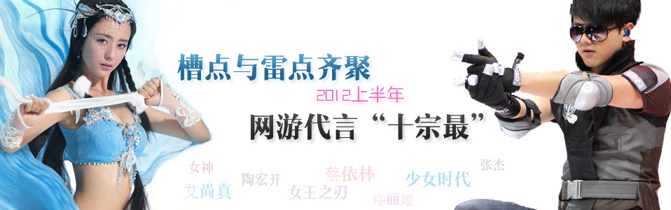 在这个萝莉萌男当道,女神人妖傻傻分不清楚的泛娱乐时代,网游代言也早已不是由广大普通一线明星牢牢霸占的地盘了。因为我们的口味变了,我们的要求多了,网游厂商的眼儿尖了,普通明星的光环早已卸下,没有点文艺或2B气息,代言的活儿也不是那么轻易找上门的。游戏不一定去玩,但是路见代言一声吼,该吐槽时就吐槽啊!今天我们就来盘点2012上半年新冒出的代言人,上至老人下至儿童,美女与野兽,应有尽有,雷点与槽点齐聚,一起来818~