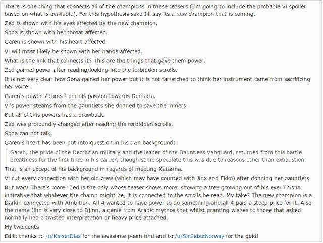 这名撸友的推测实在让人佩服,不仅脑洞开的多,还非常合理。看来新英雄很可能是一个既强大又有着神秘能力的家伙,洞察到你身上的过去并找到弱点进行打击。就像阿拉丁一样,不过TA可不会白帮你忙!