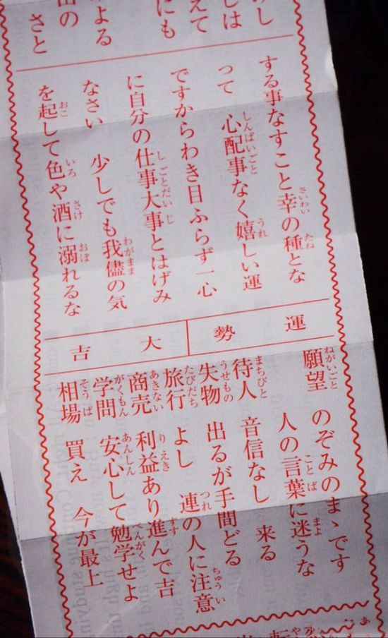 如今新年伊始,小岛秀夫按照风俗前往寺庙求签赐福,预判2016年个人运势。在大吉与大凶之间小岛秀夫幸运地获得了前者,2016年工作、学业等多方面事事顺意;不过唯独没有爱情运势,看来...