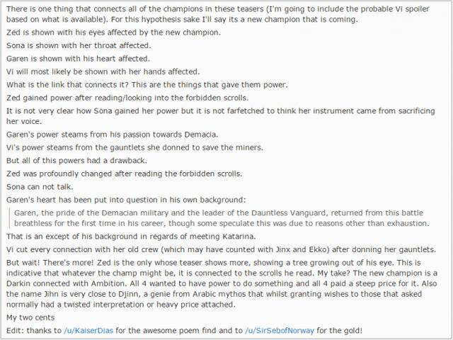“有一件事将近期所有的英雄彩蛋视频联系在了一起(基于可靠性,接下来的讨论我也会涵盖蔚)因为是假说的缘故,我将会告诉大家,新英雄要来了。