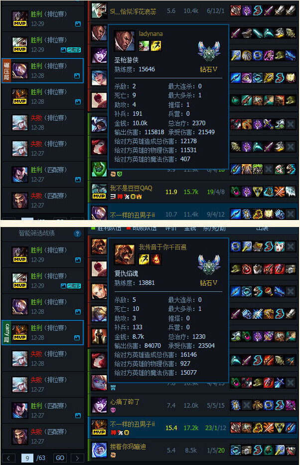 随后仔细分析了这位玩家的战绩:队友是完全随机的,并没有存在和哪位青铜玩家双排的情况,同时我们也知道排位段位相差超过一个的玩家是不可以组队的(钻石最低和白金组队,青铜最多和白银组队);