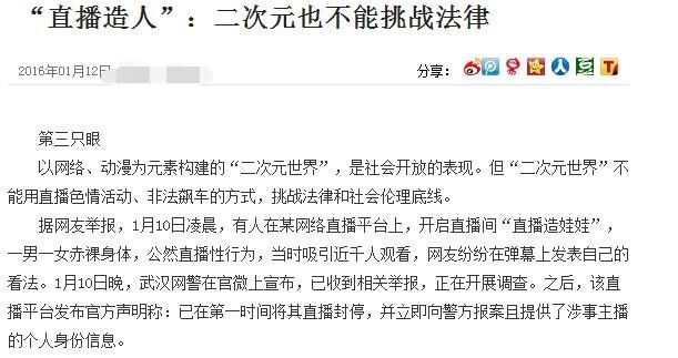 近日,国内某媒体发表了一篇名为《“直播造人”:二次元也不能挑战法律》的文章,把大家看的是一头雾水。这种网络直播怎么就和二次元扯上关系了...原因就在于文章认为“二次元世界是由网络和动漫为元素构造出来的”,看到这里突然觉得二次元真好无辜啊,这才是躺着也中枪啊。
