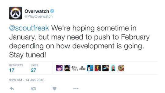 1月18日消息,《守望先锋》美服官推最近发文,表示原定于1月再度开启的Beta测试,或将要推迟到2月份,具体是否要推迟则要看开发进度。