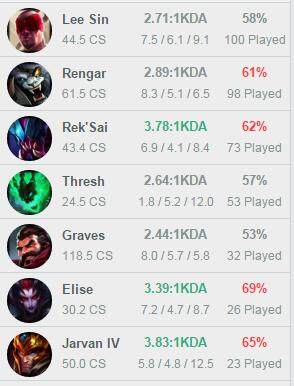 或许受制于网络高延迟值,他最常用的都是打野英雄,然而类型却基本以肉食性打野为主,例如:盲僧、傲之追猎者(狮子狗)、挖掘机,最近还开始用千珏和版本大热男枪进行冲分。