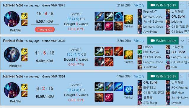 同样可怕的还有他的战绩(KDA),可以看出,如此多的人头和助攻数都是在近20分钟时间的短排位赛中完成。这打野的抓人能力,恐怕韩服前10暂时是无出其右了吧?得益于世界最优秀的网络普及,很多韩国本土的玩家在家都可以10ms以内打LOL韩服。