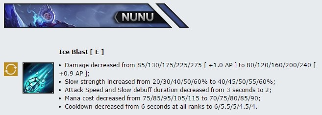 日前在PBE的测试服上努努出现了不少改动,其中变化最大的就是努努的E技能冰雹,除了伤害和效果持续时间下调以外,初期的移动速度降低有了一定程度的提升,但是在这些改动之中,最重要的就是点满后冷却时间将会从6秒降低为4秒的改动了。