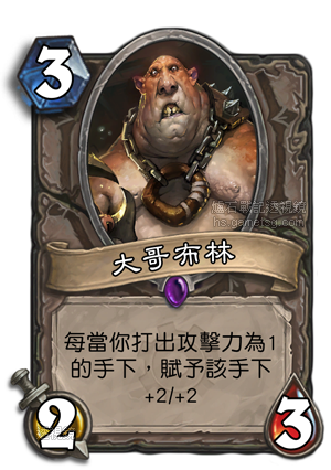 大哥布林可能是地精大战侏儒中最好的史诗卡片,虽然已经有很多人在用了,但我认为他的实力还不仅现在这样,大哥布林可以成为一套牌组的核心,随着牌池加大,大哥布林能得到的帮助会更多。相信在开放模式中的大哥布林必然有一天可以掀起波澜。