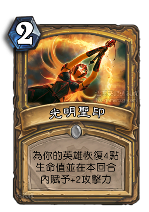 圣骑士也是一个补量十足的职业,而目前圣骑士并没有从治疗中获得什么收益,如果有一天补血骑得到一些卡片可以配合治疗来发挥效果,那么光明圣印这样又能补血又能加攻的卡片肯定会有一席之地,另外,或者设想一下2费打2血并不算亏,在一些快攻对战中,抢血又回血让你赢得胜利也是不错的选择。