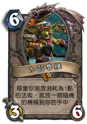 这张牌从设计上就有问题,1费法术最多的要算圣骑士,而加兹鲁维并不是让你抽牌而是让你得到不确定的机械,那么和加基森拍卖师一比,暴雪令人奇怪的设计便暴露无遗,我想在开放模式中也很难看到他有所表现,白白浪费了一个人物的传说卡片。