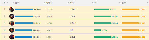 大嘴韩服各区胜率:(52.18%-青铜第四、54.26%-白银第一、54.34%-黄金第五、55.52%-白金第一、60.34%-钻石第一、55.11%、未出场。)