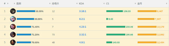 本周青铜区间没有太多的变化,王者马尔札哈依旧统治著青铜区间,只是在将来Riot的年中法师更新之后,这样的状况能否继续下去就不知道了。阿木木依旧是利用强大的团控技能名列第二,3.01的超高KDA彰显出了这支英雄在青铜区间的恐怖实力,过去青铜区间的前五名胜率英雄通常不太容易超过3的KDA,法师型的阿木木大绝开得好真的是十分凶残。三、四、五名分别是赵信、大嘴和泰坦。