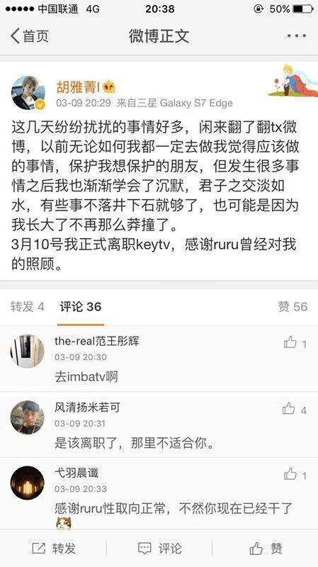 这几天纷纷扰扰的事情好多,闲来翻了翻tx微博,以前无论如何我都一定去做我觉得应该做的事情,保护我想保护的朋友,但发生很多事情之后我也渐渐学会了沉默,君子之交淡如水,有些事不落井下石就够了,也可能是因为我长大了不再那么莽撞了。3月10号我正式离职keytv,感谢ruru曾经对我的照顾。