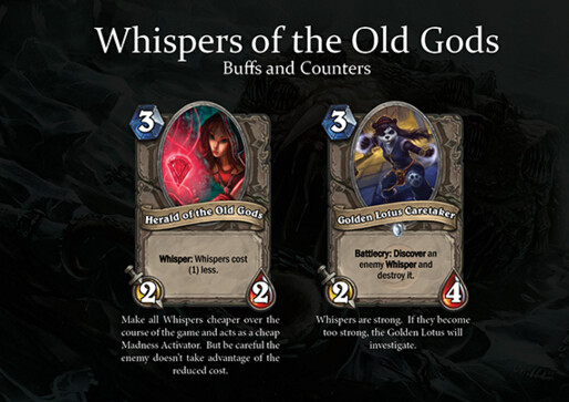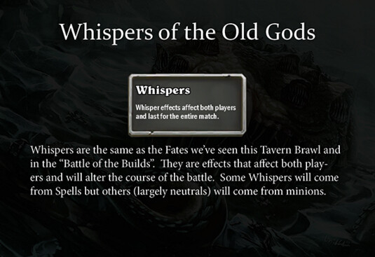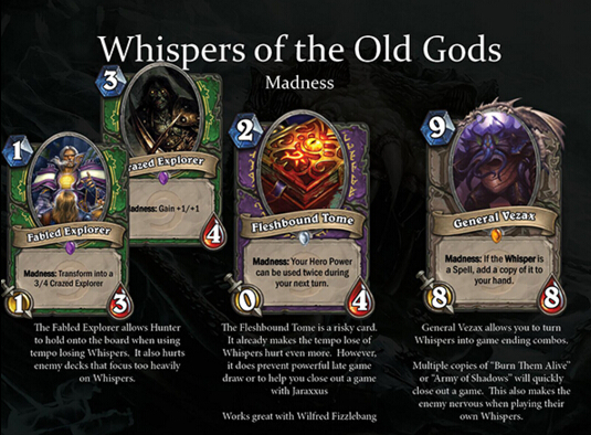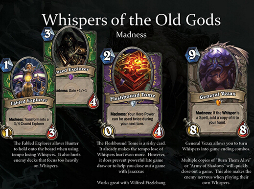 在北美的论坛上已经有玩家发现暴雪已经开始在进行广告的设置了,透过图片可以看到新版本似乎真的就是和古神有所相关(图中文字为古神的耳语。),同时就在近期网路上流传着一组图片,巧合的是卡片中的新效果正好就是"耳语",最后被证实是北美玩家自制的预测卡片,其真实程度相当高,甚至有不少人误认为就是新版本的卡片,以下就让我们在等待周末的发表会前先看看这些精美的自制卡片解解渴吧!