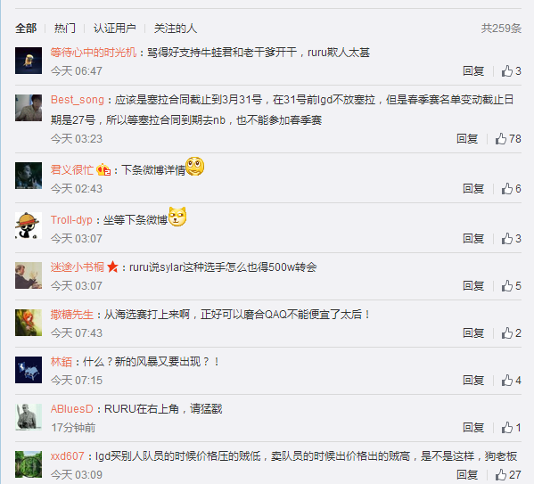 微博下面的留言说估计是塞拉的合同到期,塞拉想要转会Newbee而LGD这边不放人。塞拉和RURU的问题已经涉及到了两个俱乐部的利益问题上了,究竟之后会有怎么样的解决办法呢?