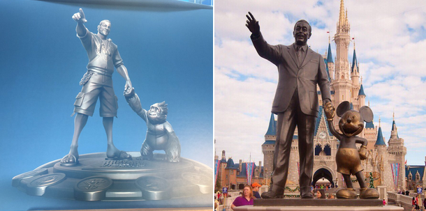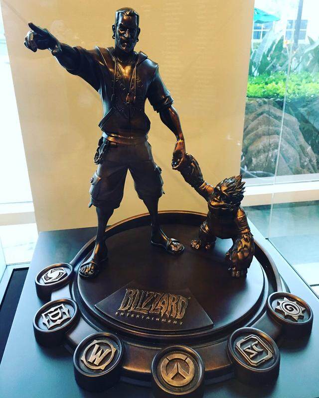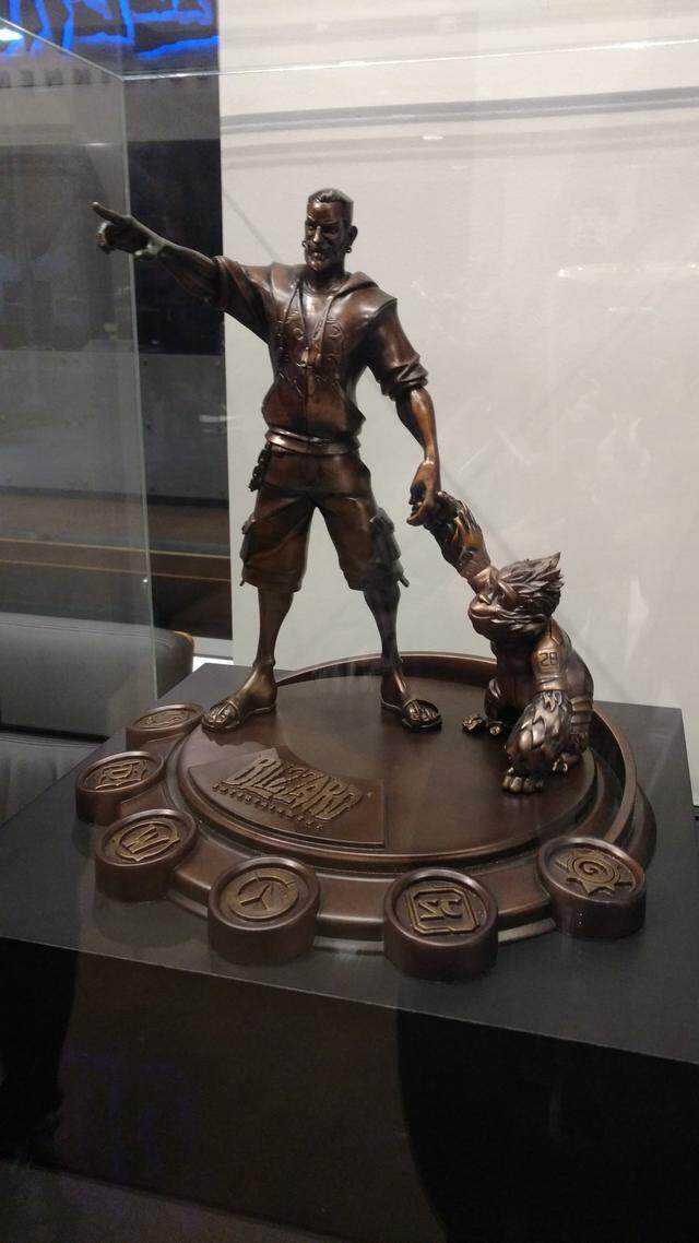 塑像原型源自守望先锋宣传片上温斯顿博士牵着幼年温斯顿看月球的场景,不过把温斯顿博士换成了梅森,而且梅森还身着联盟外套,雕像底部则是暴雪六大游戏和暴雪标志。另外,这幅雕像也与迪士尼牵着米老鼠的雕像有异曲同工之妙。