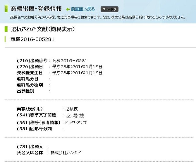 最新消息,日本老牌游戏/玩具厂商BANDAI注册了一个最新商标,按说厂家注册新商标是在普通不过的事,不过这一次注册的商标名称实在吓人——“必杀技”!