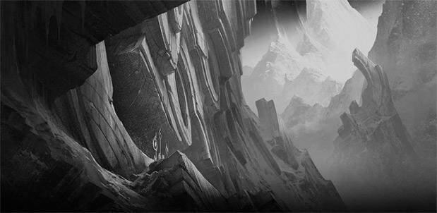 尽管存在着挑战,我们始终觉得,以龙作为原型可以给创作新英雄一个很成熟的精彩起点。随之而来的首要问题就是,我们需要明确这个龙英雄的主题或者风格。起初,我们尝试的是尘烟大地的主题,然后再把他置入到已有的符文之地背景之中。但无论是诺克萨斯的铠甲,海克斯科技的纹饰还是艾欧尼亚的华服,一披到他的身上就感觉哪里不对劲:我们的龙英雄似乎并不是符文之地的专属角色。所以我们开始着眼于更广阔的思路。正当这时,我们看到了基础设定团队所作的新插图——这个团队当时正在着手重新设定巨神峰的视觉风格与背景故事。