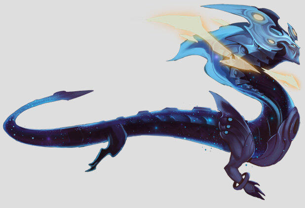 积极的反响让我们确信这是正确的方向。接下来的问题就是这条龙具体的样貌了。我们对于全世界各地关于龙的想象进行了充分的了解(比如在西方神话中,龙是飞翔在上的巨大的喷火怪兽;而在东方则是兴于水泽之间的蜿蜒蟠龙。),所以我们希望最终的结果并不会过分地倾向某一种现实中的具体方向。同时,我们也开始着手设定他的角色。一般来说,一条宏伟的太空巨龙总是感觉很帅的,但是他到底是谁呢?我们要怎样才能把这样一头有可能堪比星云的巨兽真正地带进英雄联盟的世界呢?他是如何,以及为何,与符文之地的原有居民们互动的呢?