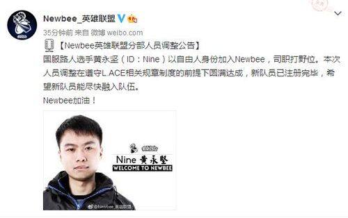 国服路人选手黄永坚(ID:Nine)以自由人身份加入Newbee,司职打野位。本次人员调整在遵守L.ACE相关规章制度的前提下圆满达成,新队员已注册完毕,希望新队员能尽快融入队伍。