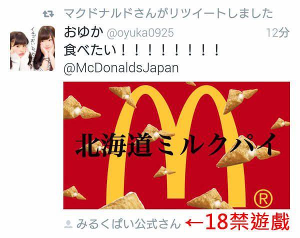 因为对北海道牛奶派评价带有“想吃”或者“好吃”的字样的推特,就会被麦当劳官方推特的直接转推,有一位熊孩子网友贴出了北海道牛奶派的海报,并说“好想吃”,结果成功钓到了麦当劳官方的转推,可是细心的网友却发现这张海报下方的标记,居然链接到了18禁游戏厂商!