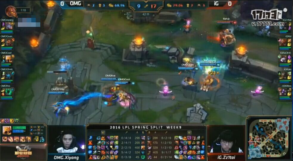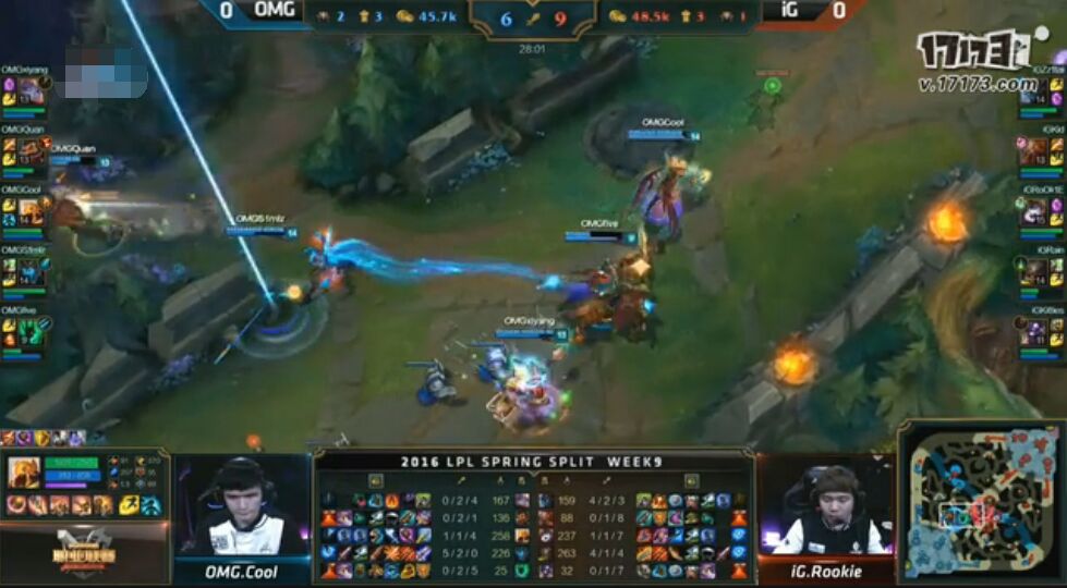 12分钟 IG四个人在OMG野区蹲死了男枪,随后OMG反打杀掉了璐璐和大树,大树拿到一血!22分钟 双方中路开团,男枪先被秒掉之后,两边AD都在疯狂输出,大嘴拿到双杀,滑板鞋拿到四杀,IG打出一波4换5!