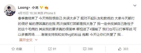 春季赛结束了 今天特别恨自己 失误太多了 挺对不起队友和教练的 大家今天都打的很好 输的原因真的在我 两次指挥打团都是我太急了 我一定会改掉自己急性子的这个毛病的 其实我的要求真的很简单 哪怕进了4强输了 我们也可以打季军战 可以多赛两场……谢谢支持我和支持vg的粉丝 抱歉 今天让你们失望了 我回去好好检讨自己。