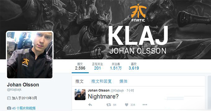 在TSM战队宣布YellOwStaR将离开队伍、离开北美不到几个小时后,现任FNC战队的辅助选手Johan “Klaj” Olsson在自己的推特上发表了最新的心情“Nightmare”——这是噩梦吗?