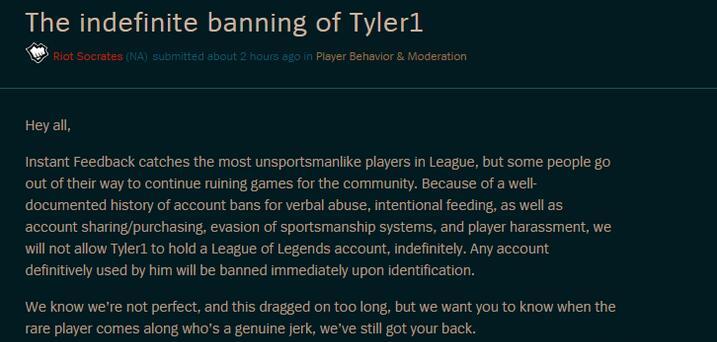 今天,拳头官方发表公告,将国外知名直播Tyler1的所有帐号无限期封号,也就是说这名主播将无法在英雄联盟游戏中出现。