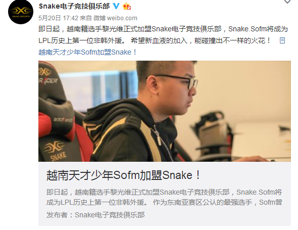 即日起,越南籍选手黎光维正式加盟Snake电子竞技俱乐部,Snake.Sofm将成为LPL历史上第一位非韩外援。