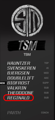 TSM宣布了这次夏季赛队伍出征的大名单,除了已经回到Fnatic的黄星不在大名单之列以外,最让人震惊的莫过于替补名单上出现了"Reginald"的字样。