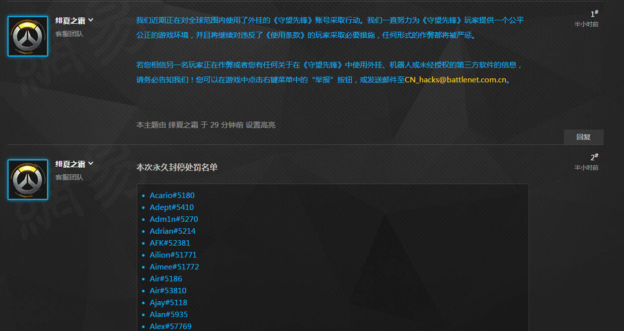 前段时间守望先锋美服已经开始着手进行对于外挂软件的打击,而现在国服也对此问题进行了处理并公布了封禁账号的名单。从名单上来看,本次遭到永久封禁的玩家数量高达1572名,而受到30天与90天封禁的玩家也有不少,这个场面只能用触目惊心来形容了。