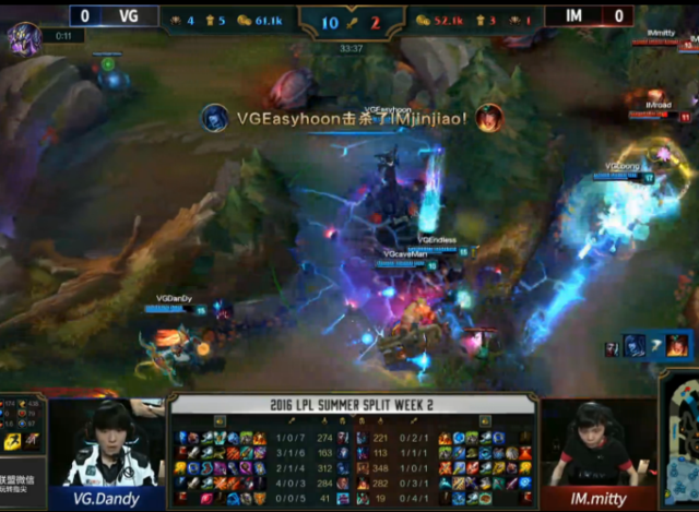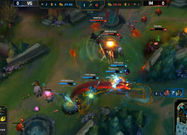20分钟,残血千珏勾引对方四人,完美操作配合冰女控制杀掉对方三人。VG一换三。22分钟,VG拿下第三条小龙,火龙。24分钟,艾克传送定住扇子妈,奥巴马输出拿下人头。奥巴马4-0-0。26分钟,冰女再次切入控制扇子妈,扇子妈再次阵亡。随后,VG拿下大龙,IM前来骚扰但被反打,VG一波一换三,千珏拿下两个人头。