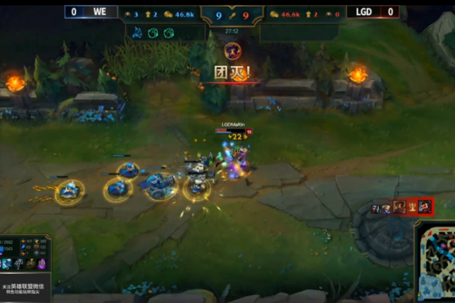 18分钟,奥巴马再次单吃掉开大的牛头,随后WE拿下峡谷先锋。19分钟,瑞兹被对方四人合力击杀,人头给到了三只手。20分钟,WE趁对方回家调整拿下了第一条水龙。24分钟,瑞兹想要单杀三只手,但艾克传送支援配合三只手反杀了瑞兹。25分钟,冰女冲动进场,想要秒掉EZ未果,反而WE损失两员大将。LGD一波0换2。27分钟,打完小龙的WE在撤退的路上被老牛和挖掘机连续控制,三只手的AOE疯狂输出。LGD打出ACE,一波3换5。