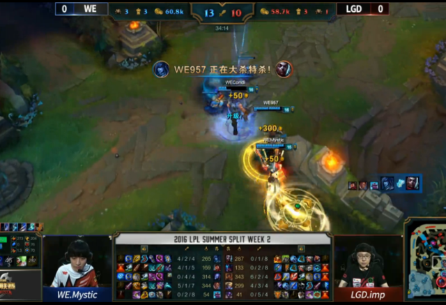 33分钟,LGD收下自己的第一条小龙,但WE追击LGD的时候逼出了对方三个闪现,随后牛头被冰女大招秒掉。34分钟,LGD传送想要断后,但阵型被打乱。WE打出了一波完美团战。一波团战后,WE果断大龙,LGD两人来干扰,但都被击杀。人头比来到了15:10,WE领先。35分钟,WE想要推上路,但被对方反打,布隆被卖掉。随后,WE抓住单带的艾克一波推下下路二塔。