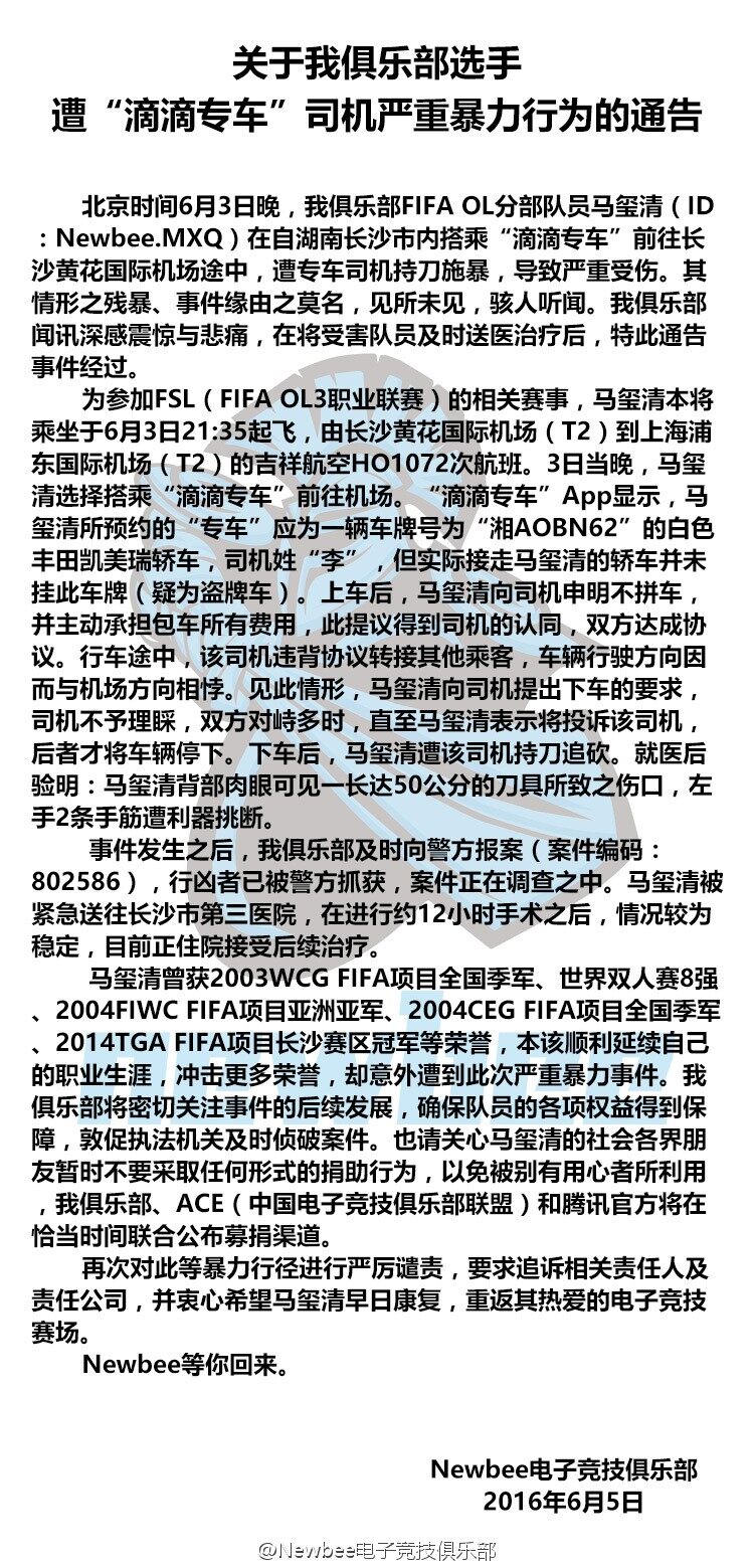 Newbee电子竞技俱乐部今天早上发出微博,题为《关于我俱乐部选手遭“滴滴专车”司机严重暴力行为的通告》,微博中公布了滴滴司机对选手MXQ的严重暴力行为。
