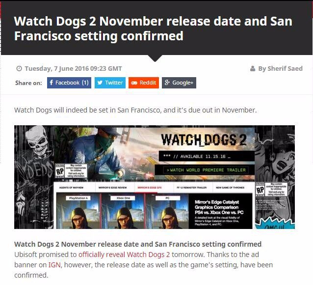 不过,喜闻乐见的手滑又来了!IGN游戏广告横幅不小心将《看门狗2》的发售时间提前泄露,从图片中我们可以看到《看门狗2》的发售日期为2016年11月15日,故事发生地为旧金山(San Francisco)!并且主角也露脸了,关注《看门狗2》的玩家们可以仔细研究研究图片中的信息。