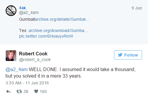 据外媒披露,本周匿名黑客团队对Gumball进行了破解,他们不仅绕过了先进的版权保护机制,而且其中一名名为4am的黑客还成为了首个发现了Gumball彩蛋的人。另外值得一提的是,游戏开发者Robert A. Cook还在推特上对4am表示祝贺,他表示预想的是1000年后才会有人发现这个彩蛋,没想到33年后这个人就出现了。