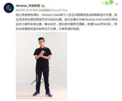 6月28日,Newbee战队英雄联盟分部宣布对内主力中单Dade因签证问题回韩国处理,无缘参加本次德玛西亚杯小组赛。