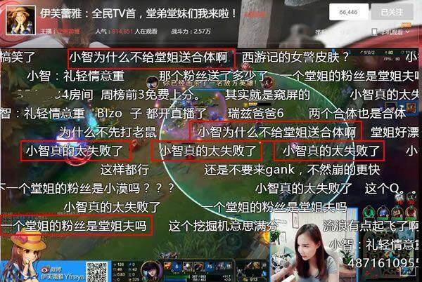 作为堂姐的头号粉丝,小智一改平日里7点才姗姗来迟的风格,早在下午5点就开播,静静等候堂姐的到来。玩了两小时的《守望先锋》后,小智终于与堂姐重新连接!当熟悉的两把声音出现在一个频道,仿佛当年“午夜悄悄话”的日子又回来了!就在观众还期待两人会有什么重逢的甜言蜜语时,一位名为“一个堂姐的粉丝”的观众,夺去了大家的眼球。这位粉丝从一开播,就给堂姐刷礼物,引得直播间“66666”的弹幕停不下来。堂姐也娇羞地感谢这位粉丝。
