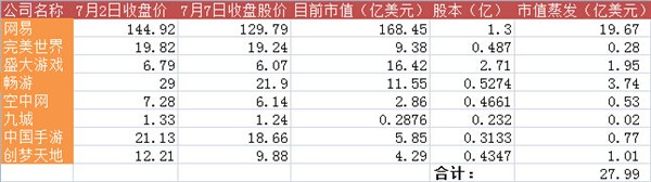 部分中国概念游戏股两日市值蒸发(注:7月3日美国独立日休市,7月4、5日为周末)