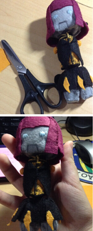 “看到有好多网友秀出DIY的英雄布偶,好像没什么难度嘛。过两天是我和男友恋爱一周年纪念日了。我决定自己缝制一个发条布偶送给他。我知道他最喜欢发条这个英雄。虽然他不说,但我是知道的。我发现做一个小布偶需要足够的耐心,并不像我想的那么容易,好在终于坚持做好了。开心~!”