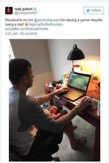 即便现在当了父亲,海沃德也依然是游戏不离手,甚至把女儿扔在腿上不管不顾,连爵士队友戈贝尔都看不下去了。