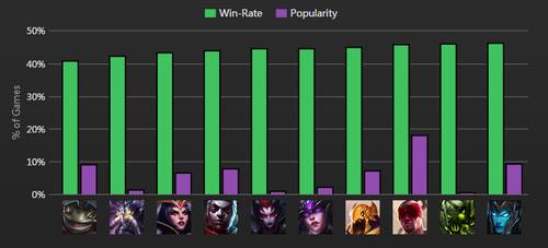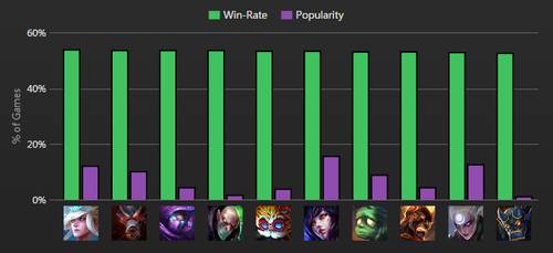 中单AP刺客的骄傲妖姬已经连续两周上榜了,而即便在现在国服比赛依然非Ban必选的复仇之矛在经过削弱之后胜率也落到了倒数第十的位置,虽然基础AD有一些加强,但是强行将普通输出砍到90%的改动让复仇之矛的地位一落千丈。