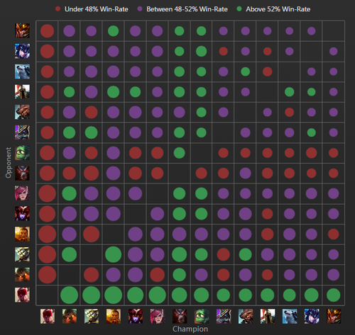 4、在对位分析中,圆圈颜色表示胜率,绿色为胜率大于52%,紫色为48%~52%,红色为小于48%。