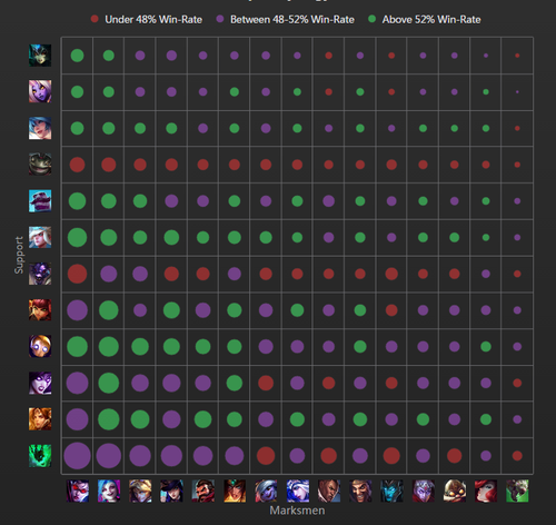 3、在对位分析中,选取每个位置出现次数最多的10个英雄,图中圆圈大小表示该种对局的数量多少,越接近左下则次数越多。