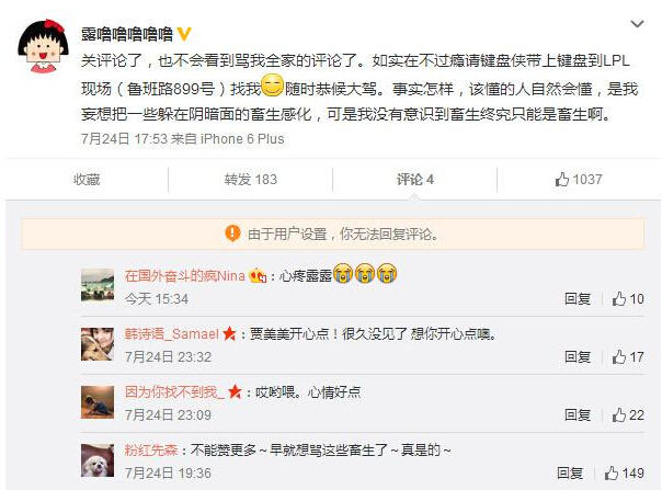 OMG领队露露和粉丝互掐事件,个人觉得双方都有责任,。毕竟大家都是年轻人,也都是有脾气的,,而且最近OMG正值多事之秋,作为OMG领队,相信压力确实不小,但是不该辱骂粉丝,毕竟露露也算是公众人物,而且OMG的现状确实和露露有关。同样作为粉丝,相信看到OMG现在的状况,确实很担忧或者不满,发言也只是求得一个安慰或者发泄一下情绪,但希望各位撸友理性发言,大家就事论事,不要做无谓的人身攻击和盲目的揣测。不忘初心,方得始终。