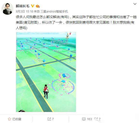 近日,长毛老师终于通过一条微博解释了自己最近的缺席状况。一是在忙公司的事情,二则是出差了一趟美国。他还贴上了一张自己玩Pokemon GO的图片,以示自己在美国(中国正常渠道还不能玩)。