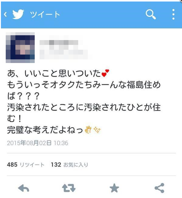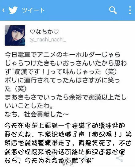 千万别招惹动漫宅!日本一个极其厌恶宅男的绿茶婊なちか,在电车上看到一位吊着LoveLive挂饰的大叔就诬陷人家为痴汉,害人家被警察带走调查。接着她发到推特上幸灾乐祸,结果在日推上炸开了。看不下去的阿宅扒出她的照片进行丑化PS,技术宅直接入侵主页将其注销,更有人肉到她的住所……真是不作不死啊。