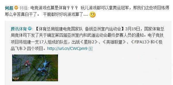 关于何超的故事,不得不提2013年发生的两件事。第一件事是3月份,当时国家体育总局发布了通知,关于组建电竞国家队备战亚洲室内运动会,结果何超在个人认证微博上转发评论次消息,“电子竞技也算体育?玩儿游戏都可以拿奥运冠 军,那我们这些项目练得这么辛苦真白干了,干脆好好玩游戏算了……”此番评论立即引起诸多网友以及电竞圈内名将强烈不满,随即一番骂战就此展开。